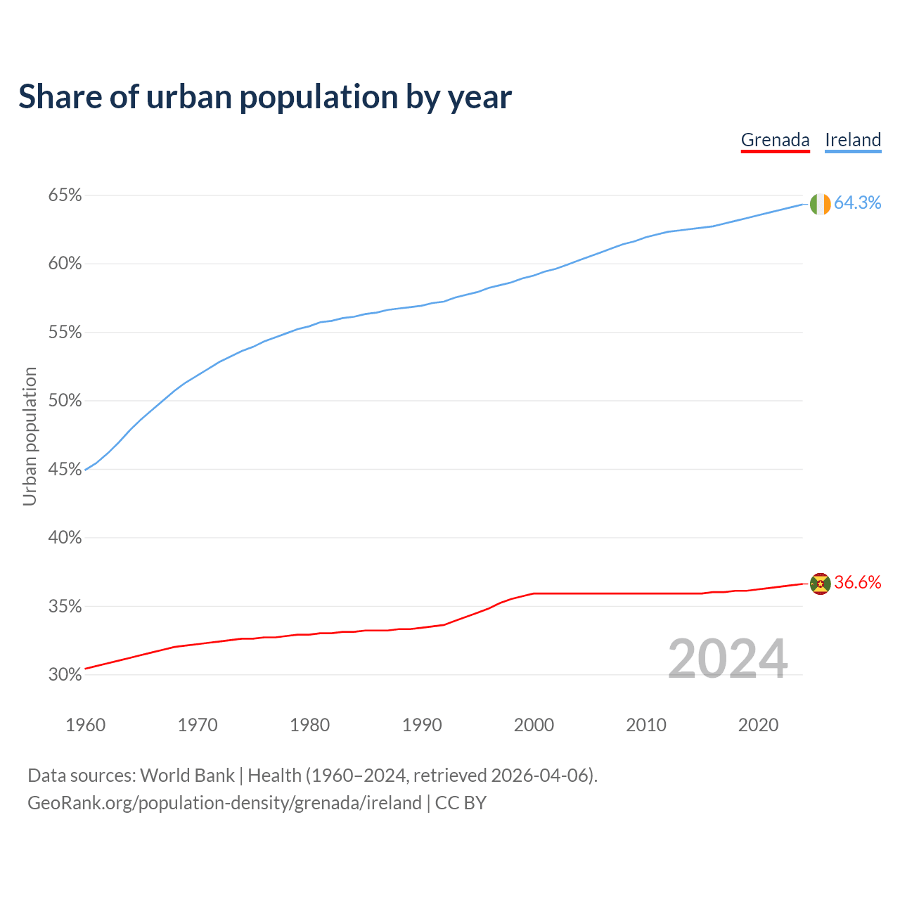 From 2004 to 2024, the share of urban population changed from 35.9% to 36.6% in Grenada and from 60.2% to 64.3% in Ireland.