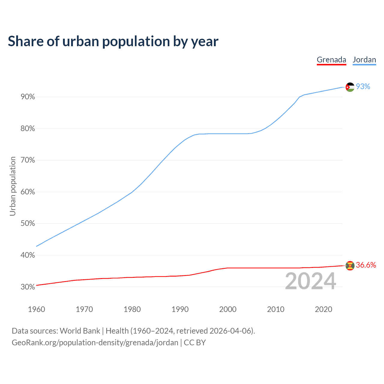 From 2004 to 2024, the share of urban population changed from 35.9% to 36.6% in Grenada and from 78.3% to 93% in Jordan.