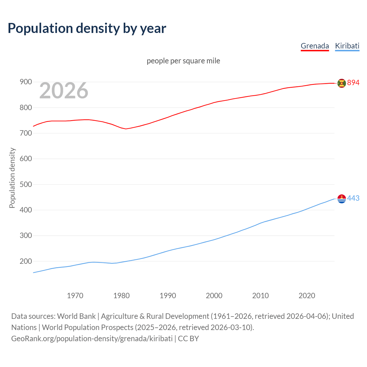 From 2006 to 2026, population density in Grenada increased by 6.6%, compared to a 38.5% growth in Kiribati.