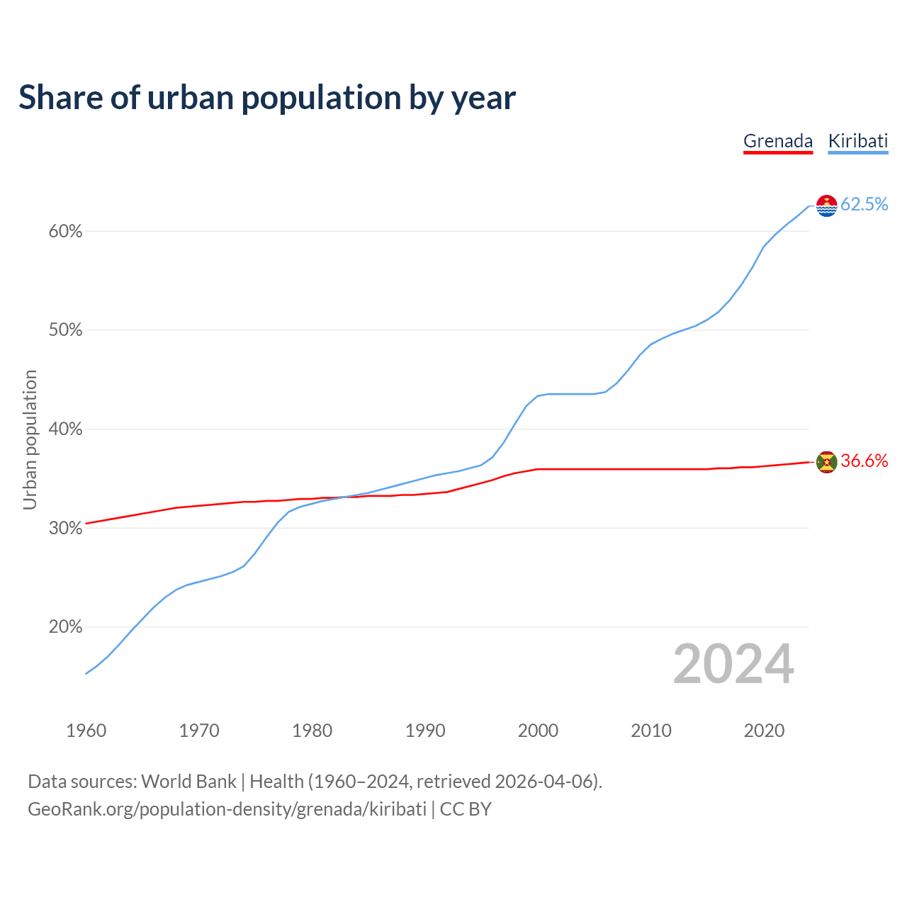 From 2004 to 2024, the share of urban population changed from 35.9% to 36.6% in Grenada and from 43.5% to 62.5% in Kiribati.