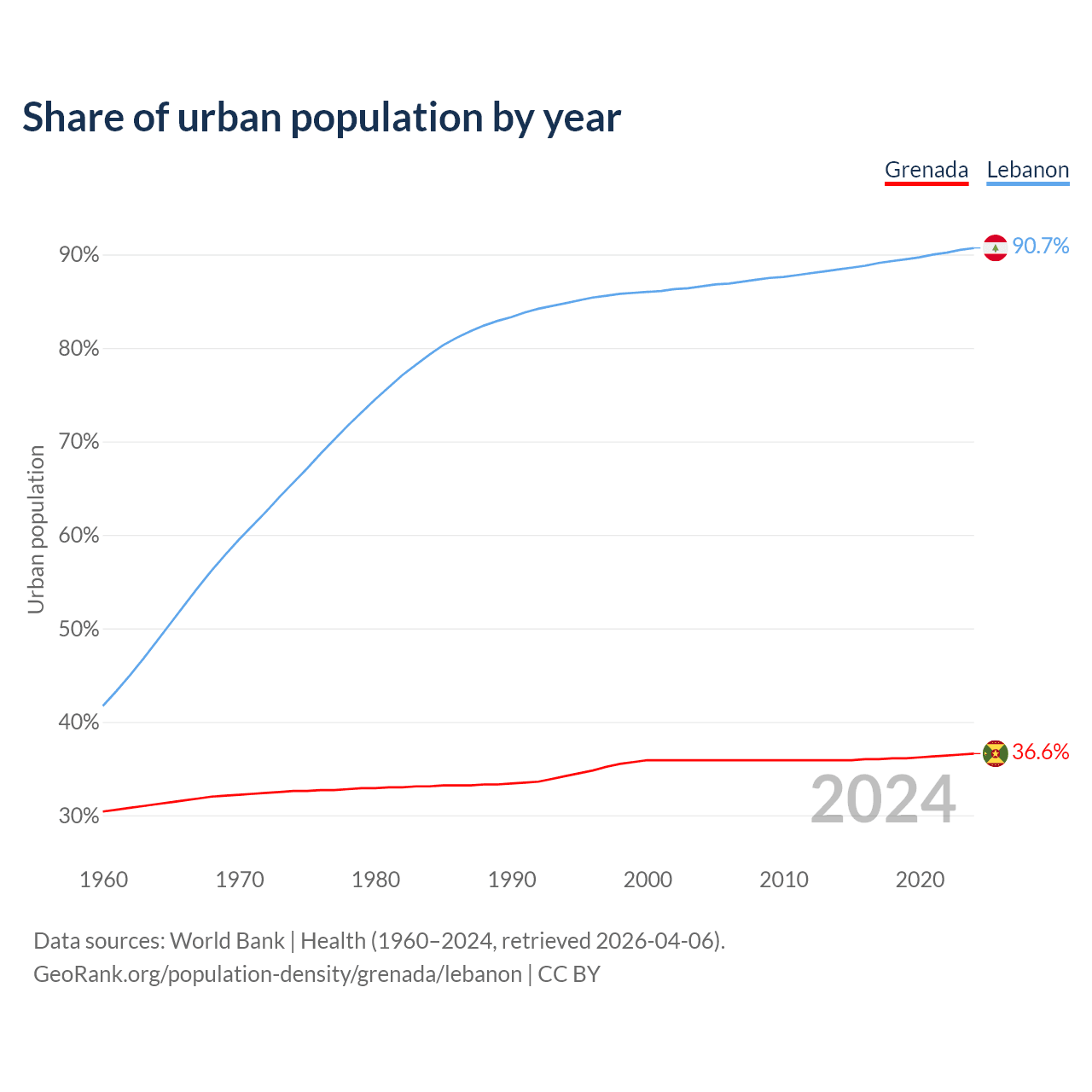 From 2004 to 2024, the share of urban population changed from 35.9% to 36.6% in Grenada and from 86.6% to 90.7% in Lebanon.