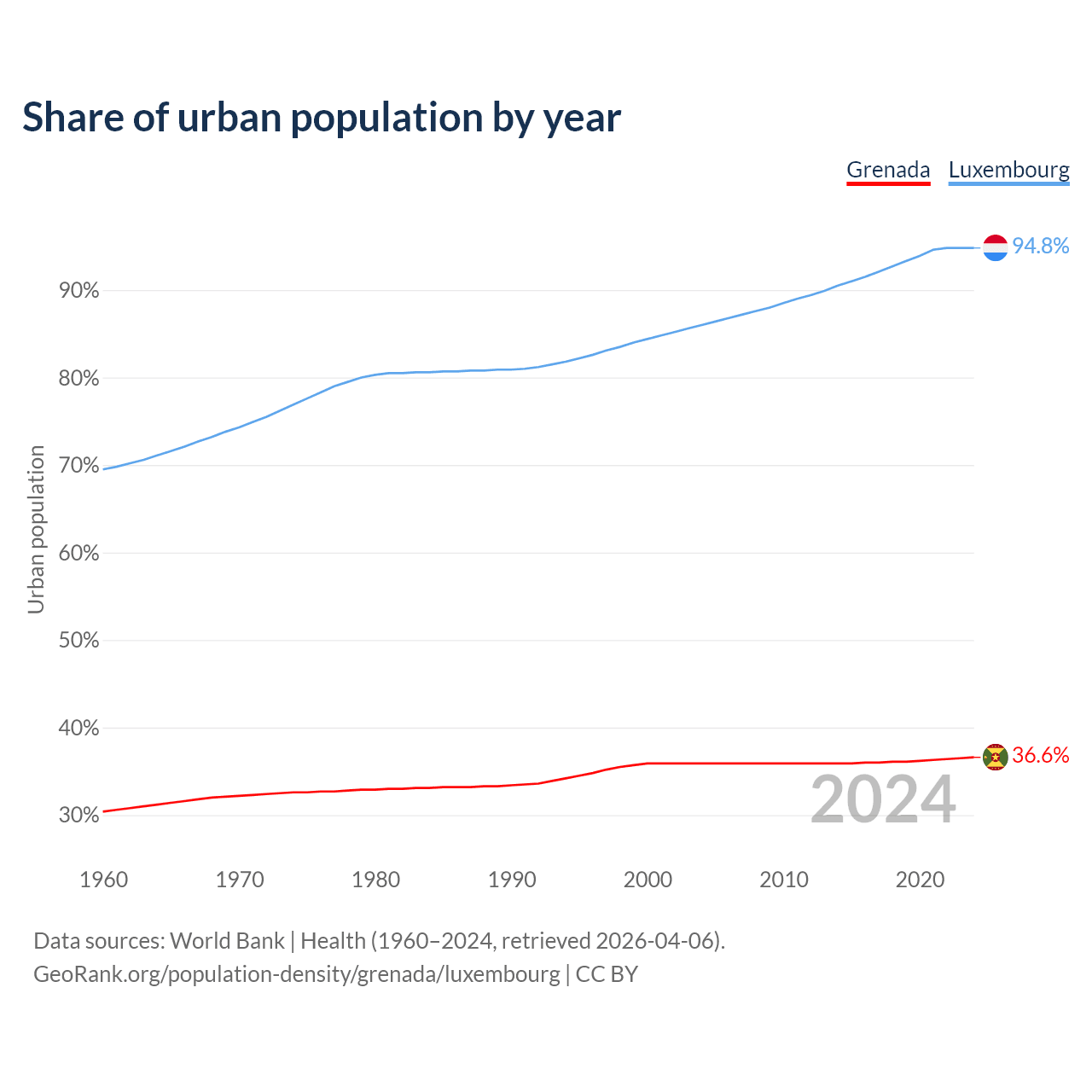 From 2004 to 2024, the share of urban population changed from 35.9% to 36.6% in Grenada and from 86% to 94.8% in Luxembourg.