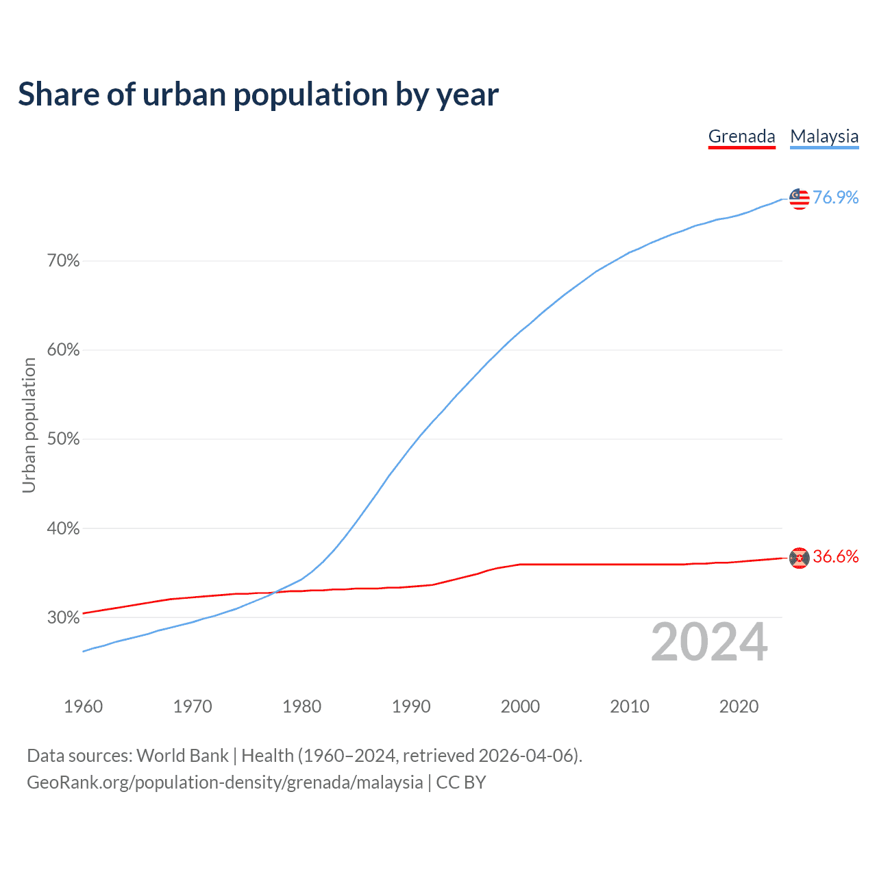 From 2004 to 2024, the share of urban population changed from 35.9% to 36.6% in Grenada and from 66.1% to 76.9% in Malaysia.