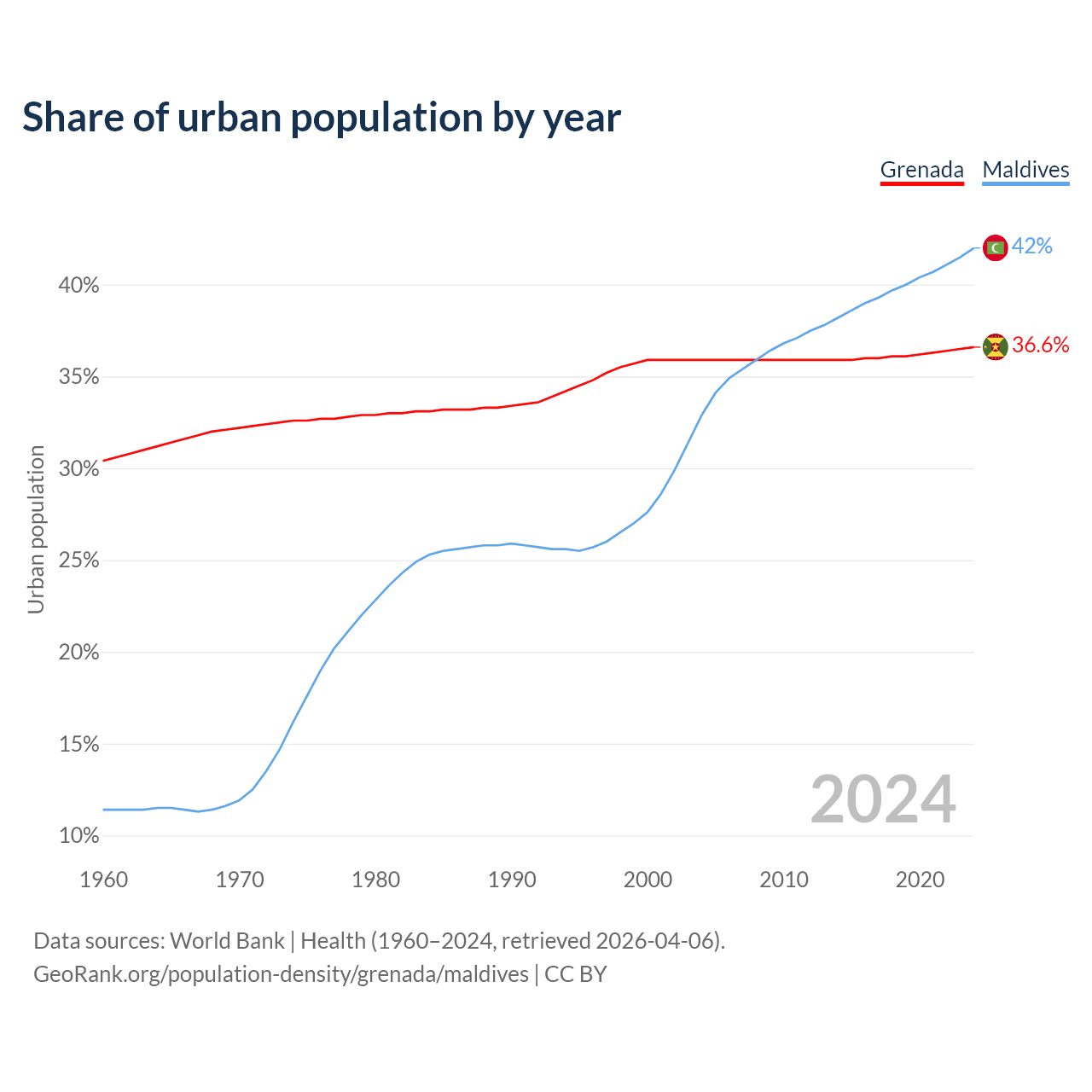 From 2004 to 2024, the share of urban population changed from 35.9% to 36.6% in Grenada and from 32.9% to 42% in Maldives.