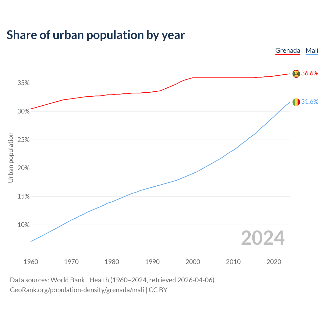 From 2004 to 2024, the share of urban population changed from 35.9% to 36.6% in Grenada and from 20.5% to 31.6% in Mali.