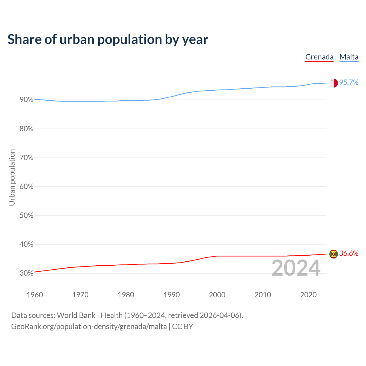 From 2004 to 2024, the share of urban population changed from 35.9% to 36.6% in Grenada and from 93.6% to 95.7% in Malta.