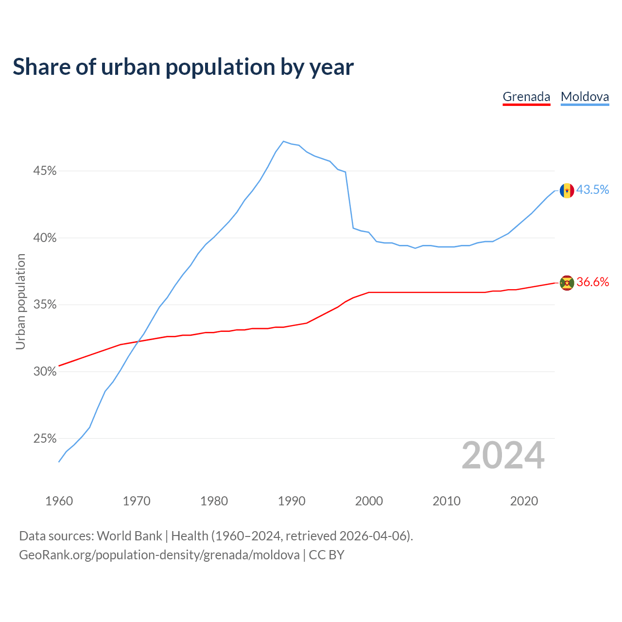 From 2004 to 2024, the share of urban population changed from 35.9% to 36.6% in Grenada and from 39.4% to 43.5% in Moldova.