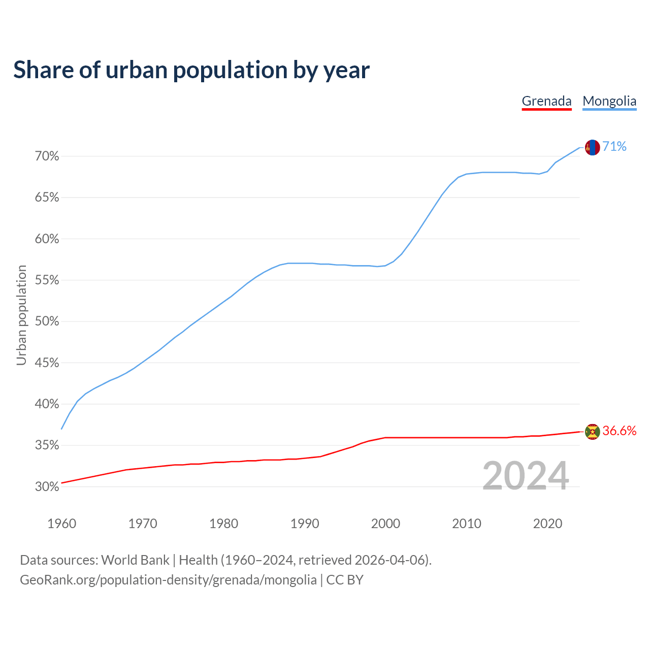 From 2004 to 2024, the share of urban population changed from 35.9% to 36.6% in Grenada and from 60.8% to 71% in Mongolia.