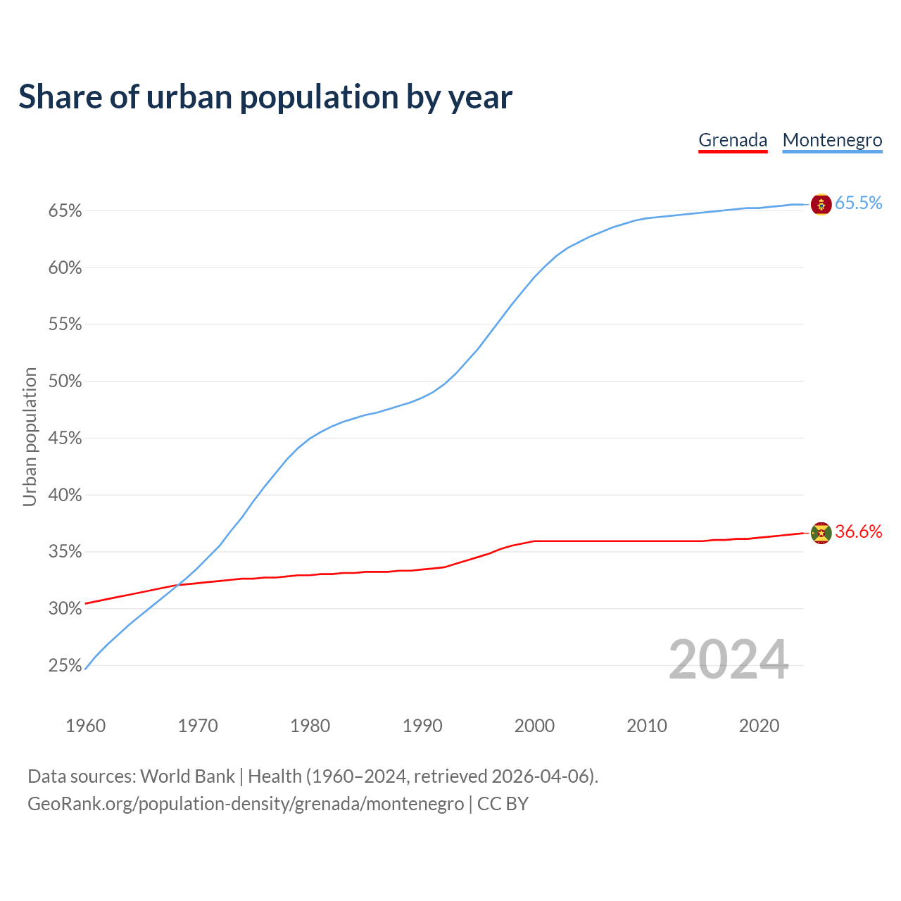 From 2004 to 2024, the share of urban population changed from 35.9% to 36.6% in Grenada and from 62.2% to 65.5% in Montenegro.