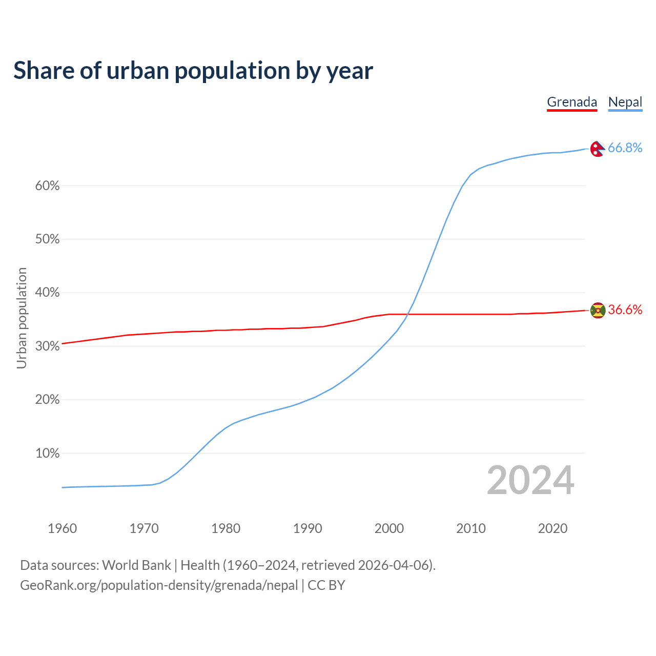 From 2004 to 2024, the share of urban population changed from 35.9% to 36.6% in Grenada and from 41.6% to 66.8% in Nepal.