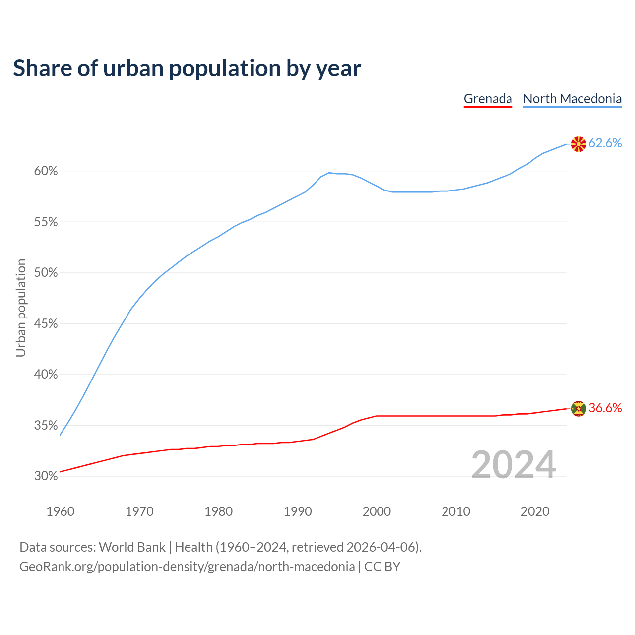 From 2004 to 2024, the share of urban population changed from 35.9% to 36.6% in Grenada and from 57.9% to 62.6% in North Macedonia.