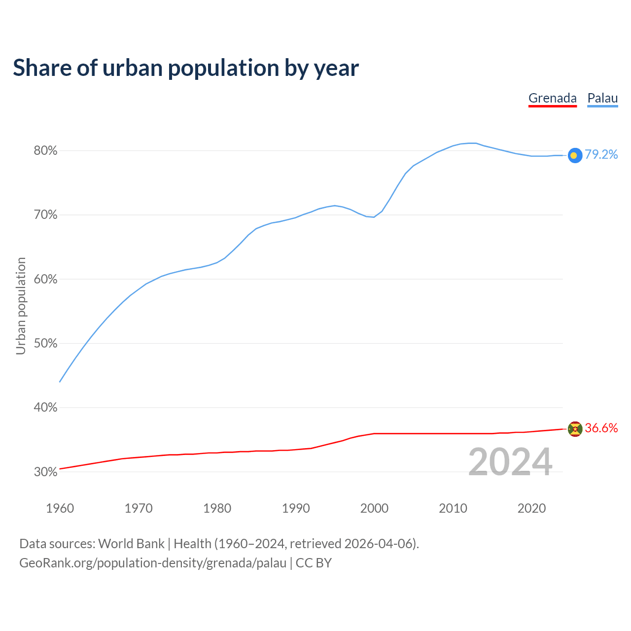 From 2004 to 2024, the share of urban population changed from 35.9% to 36.6% in Grenada and from 76.4% to 79.2% in Palau.