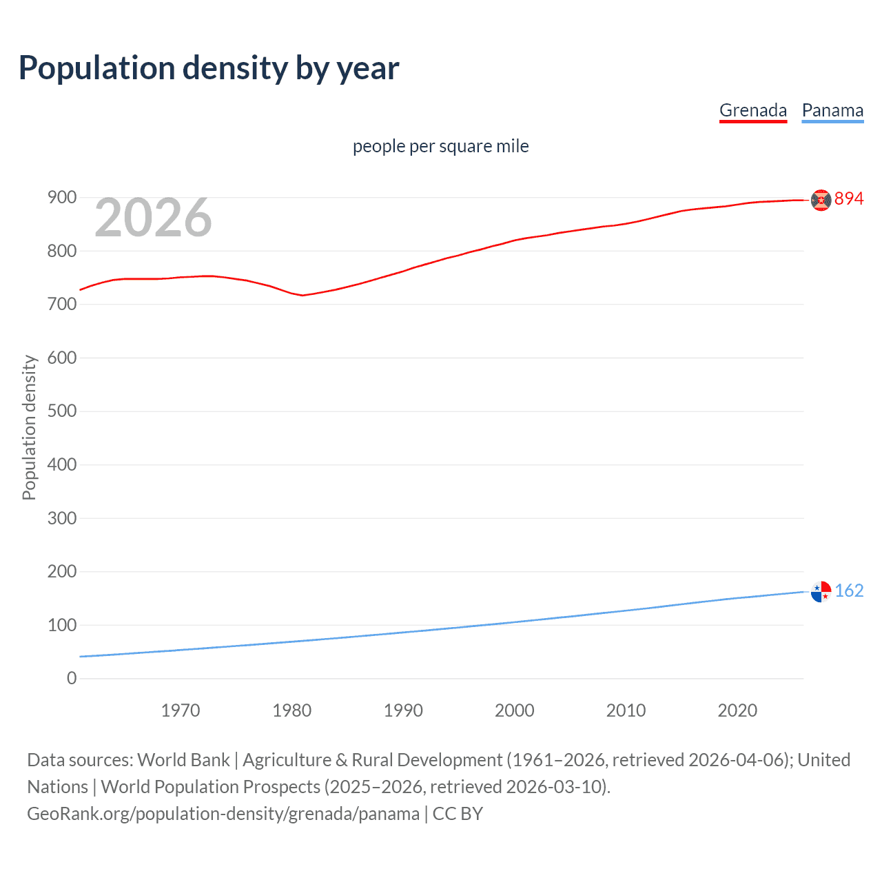 From 2006 to 2026, population density in Grenada increased by 6.6%, compared to a 37.4% growth in Panama.