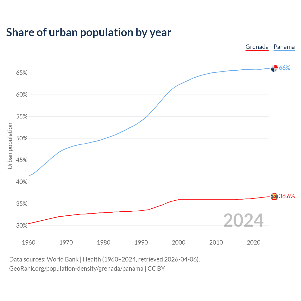 From 2004 to 2024, the share of urban population changed from 35.9% to 36.6% in Grenada and from 63.8% to 66% in Panama.