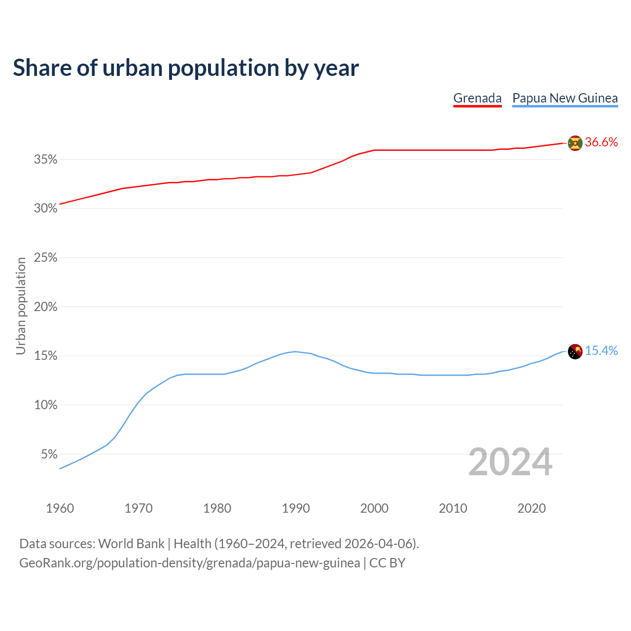 From 2004 to 2024, the share of urban population changed from 35.9% to 36.6% in Grenada and from 13.1% to 15.4% in Papua New Guinea.