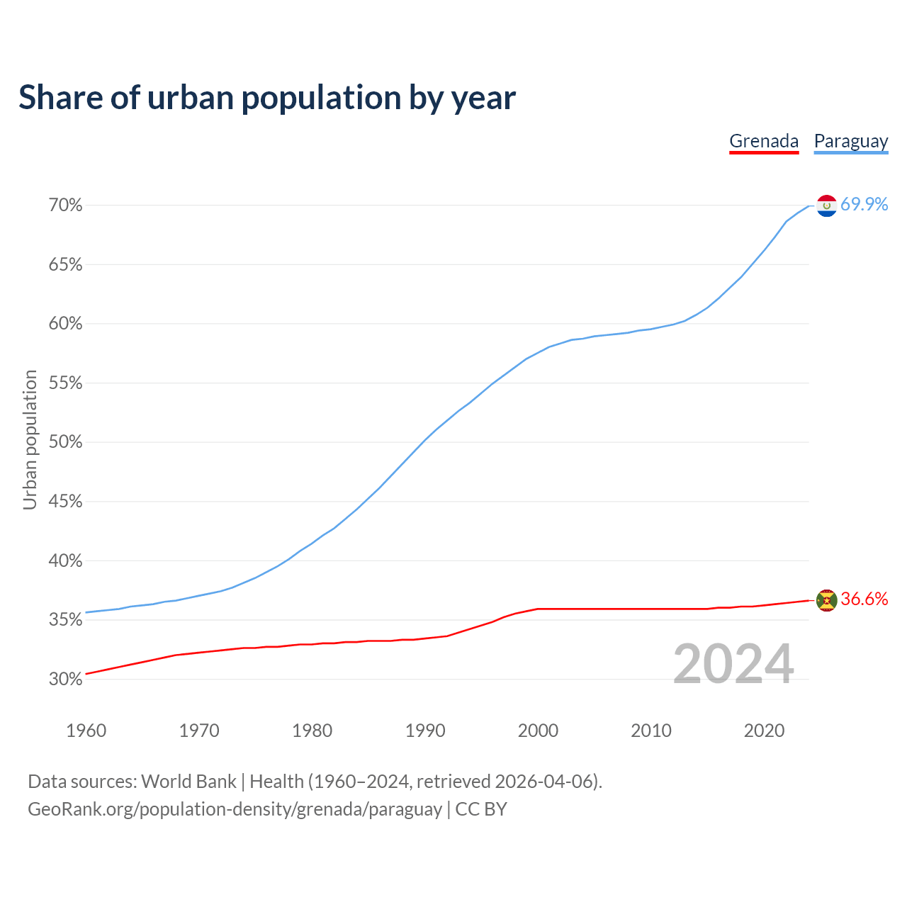 From 2004 to 2024, the share of urban population changed from 35.9% to 36.6% in Grenada and from 58.7% to 69.9% in Paraguay.