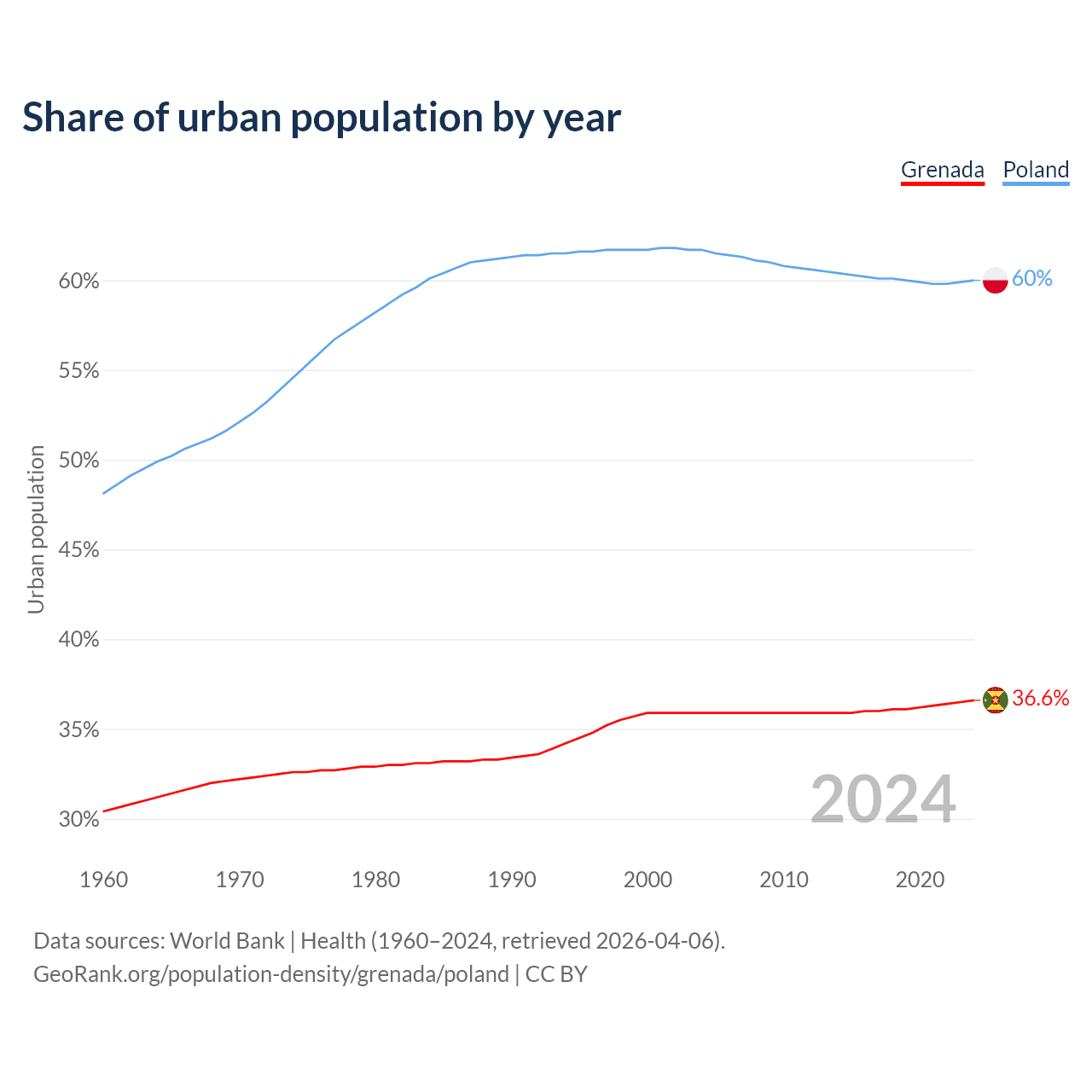 From 2004 to 2024, the share of urban population changed from 35.9% to 36.6% in Grenada and from 61.7% to 60% in Poland.