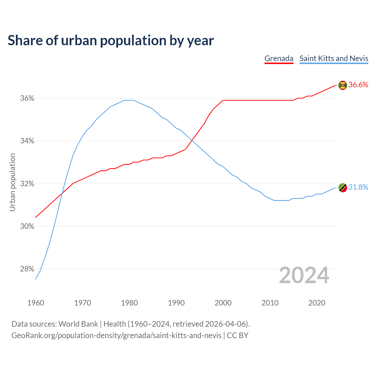 From 2004 to 2024, the share of urban population changed from 35.9% to 36.6% in Grenada and from 32.1% to 31.8% in Saint Kitts and Nevis.