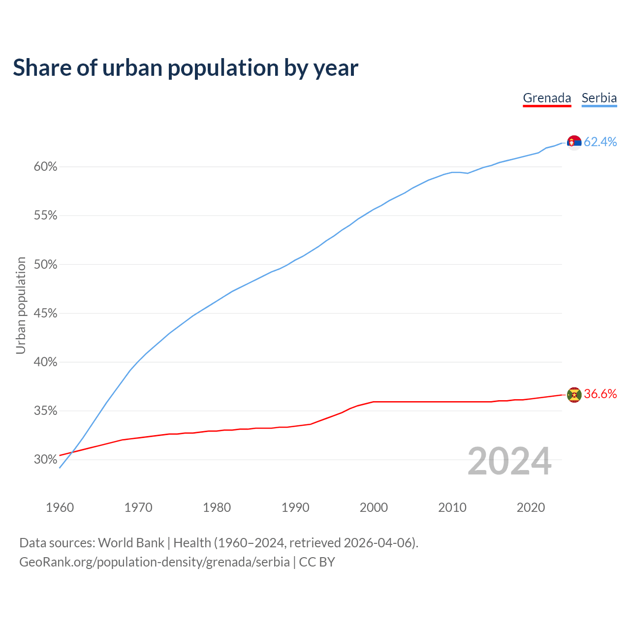 From 2004 to 2024, the share of urban population changed from 35.9% to 36.6% in Grenada and from 57.3% to 62.4% in Serbia.