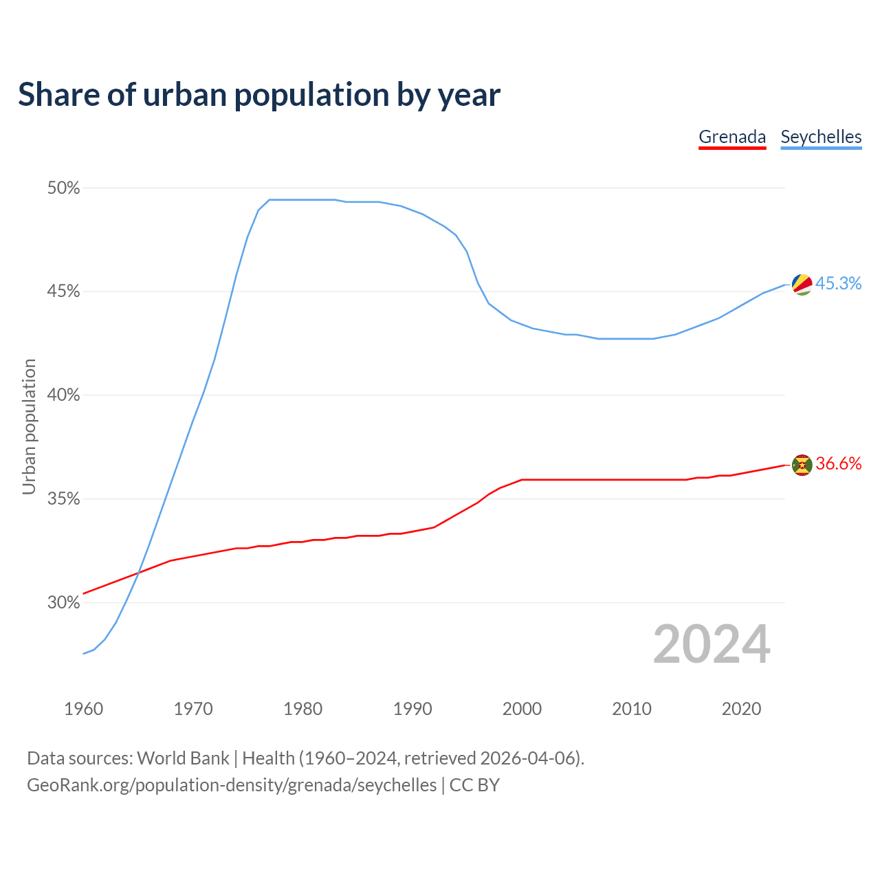 From 2004 to 2024, the share of urban population changed from 35.9% to 36.6% in Grenada and from 42.9% to 45.3% in the Seychelles.