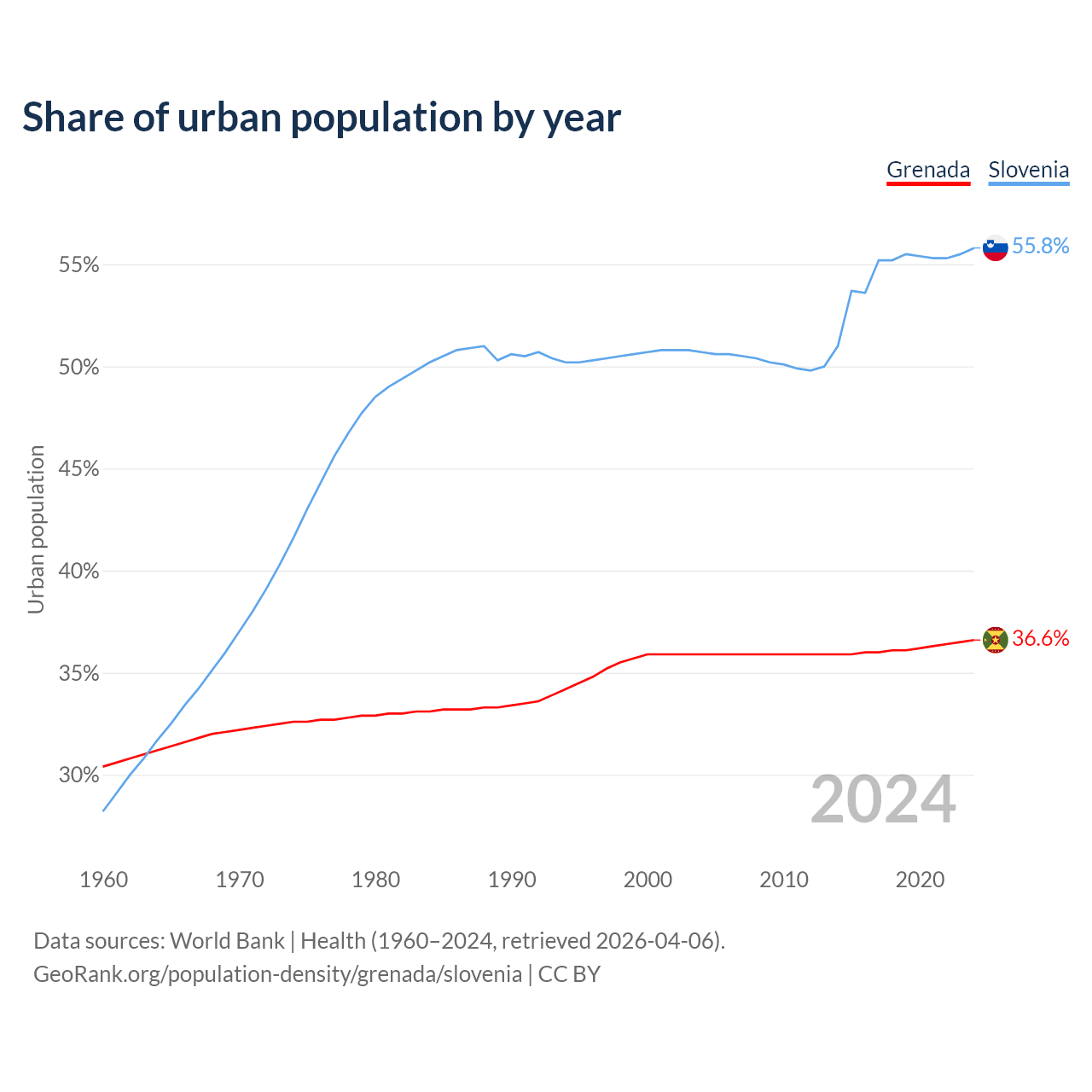 From 2004 to 2024, the share of urban population changed from 35.9% to 36.6% in Grenada and from 50.7% to 55.8% in Slovenia.