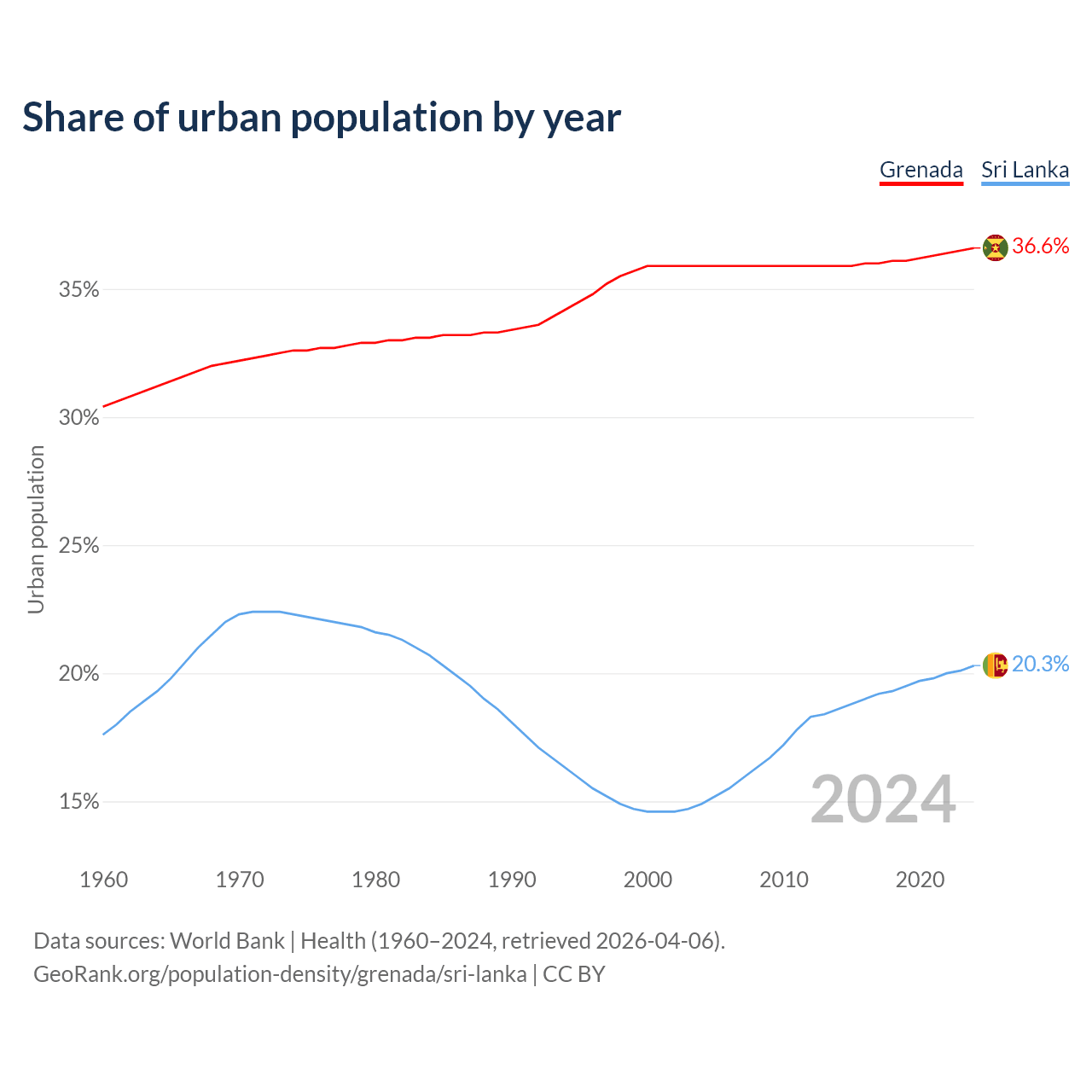 From 2004 to 2024, the share of urban population changed from 35.9% to 36.6% in Grenada and from 14.9% to 20.3% in Sri Lanka.