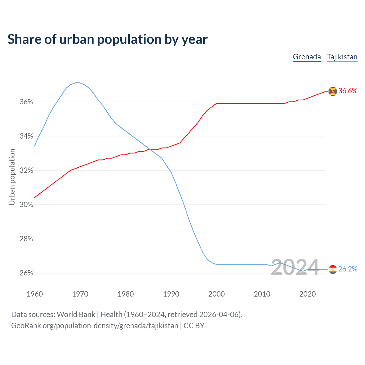From 2004 to 2024, the share of urban population changed from 35.9% to 36.6% in Grenada and from 26.5% to 26.2% in Tajikistan.