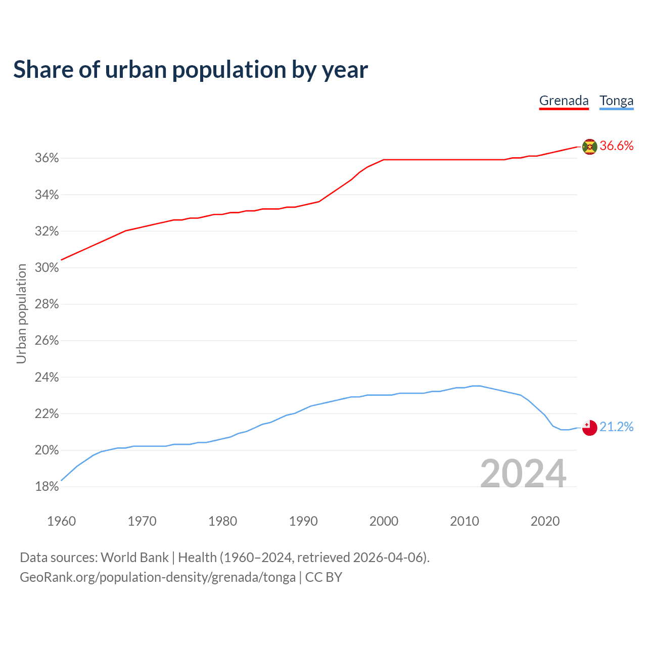 From 2004 to 2024, the share of urban population changed from 35.9% to 36.6% in Grenada and from 23.1% to 21.2% in Tonga.