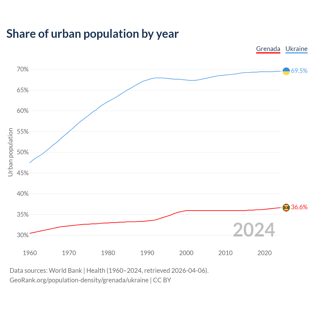 From 2004 to 2024, the share of urban population changed from 35.9% to 36.6% in Grenada and from 67.6% to 69.5% in Ukraine.