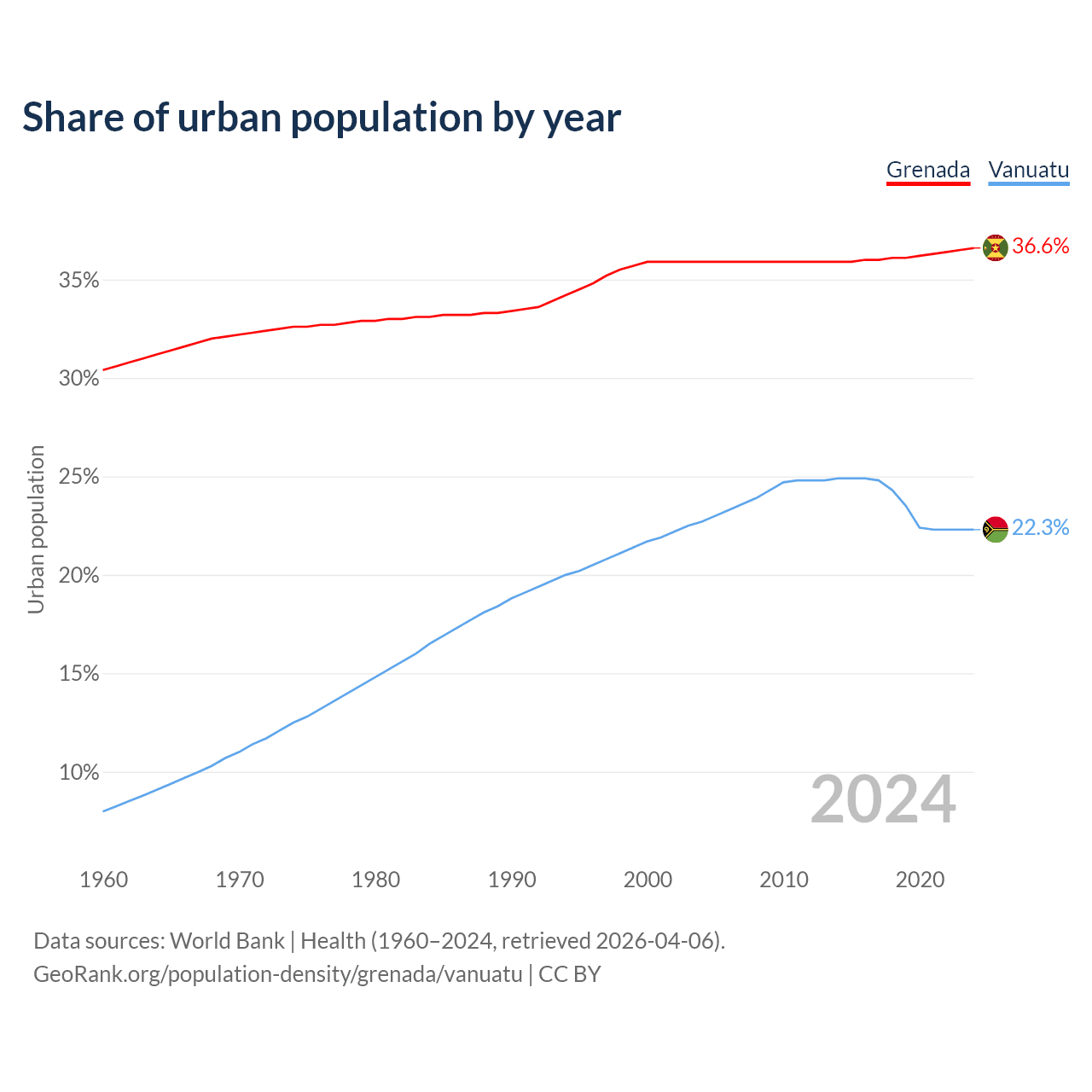 From 2004 to 2024, the share of urban population changed from 35.9% to 36.6% in Grenada and from 22.7% to 22.3% in Vanuatu.