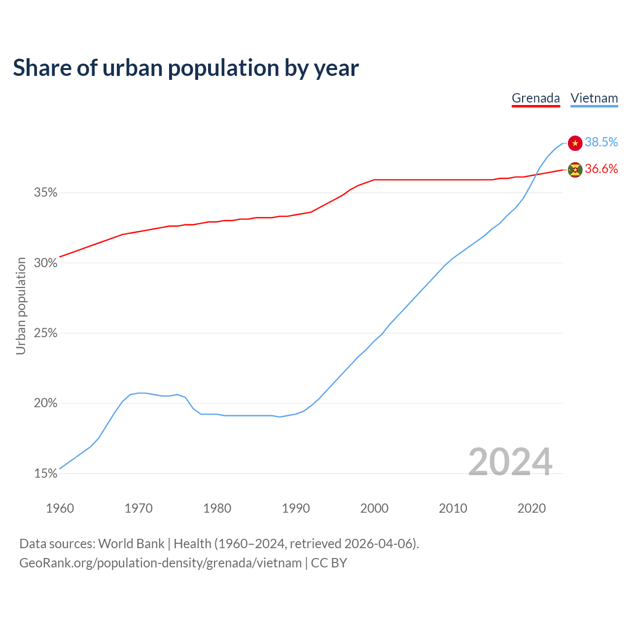 From 2004 to 2024, the share of urban population changed from 35.9% to 36.6% in Grenada and from 26.8% to 38.5% in Vietnam.