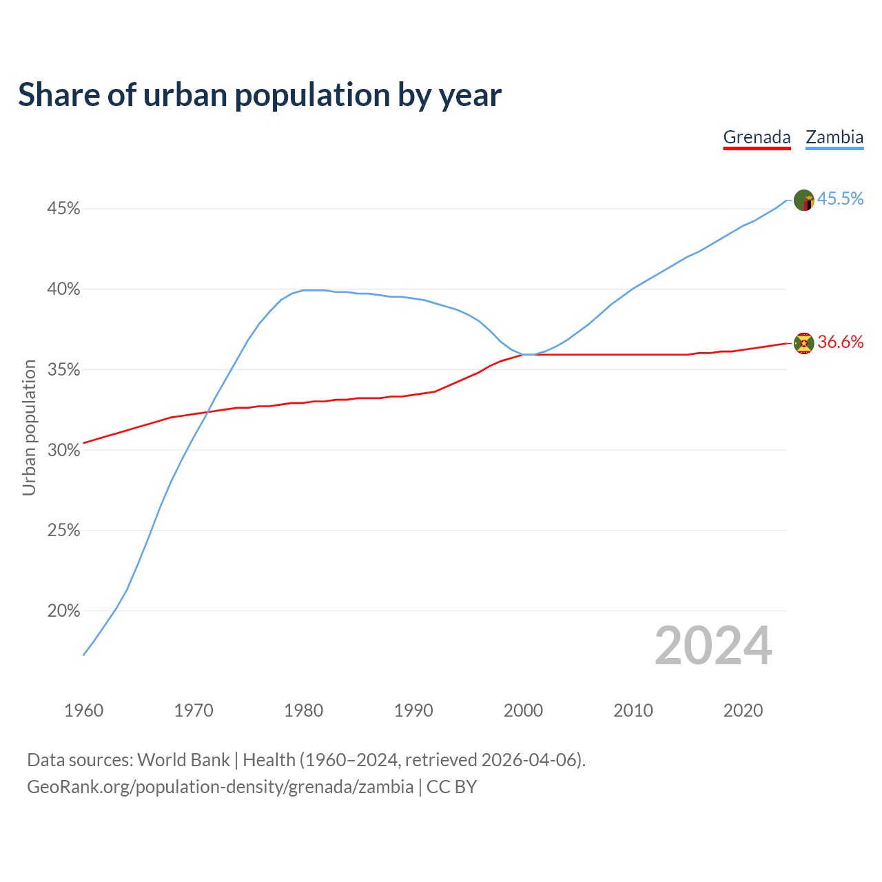 From 2004 to 2024, the share of urban population changed from 35.9% to 36.6% in Grenada and from 36.8% to 45.5% in Zambia.