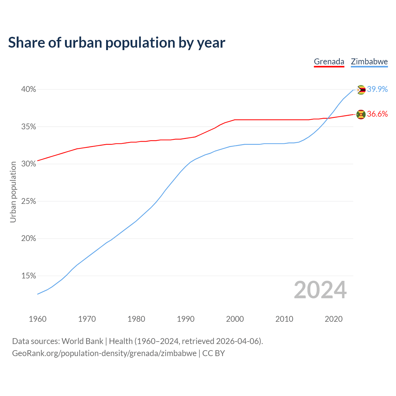 From 2004 to 2024, the share of urban population changed from 35.9% to 36.6% in Grenada and from 32.6% to 39.9% in Zimbabwe.