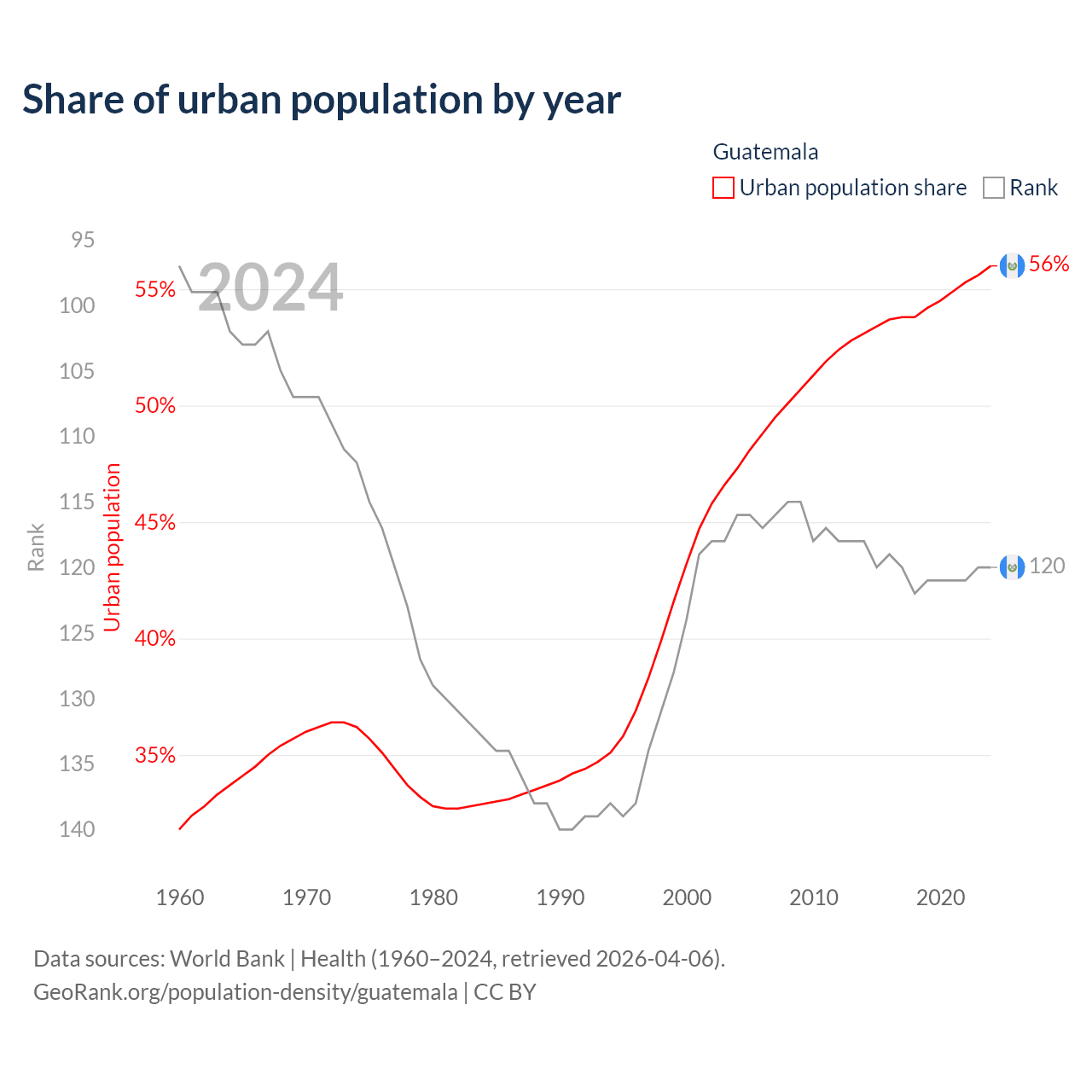 This chart shows the share of urban population in Guatemala from 1960 to 2024: 31.8% lived in urban areas in 1960, 43.2% in 2000, and 56% in 2024.
