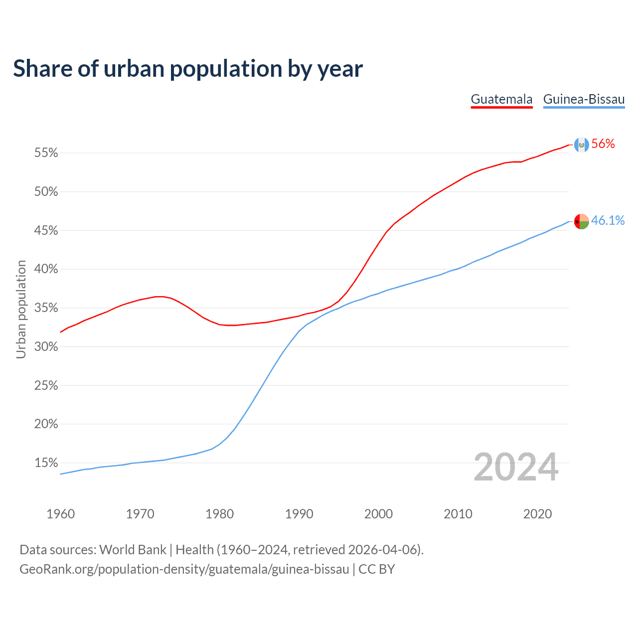 From 2004 to 2024, the share of urban population changed from 47.3% to 56% in Guatemala and from 38.1% to 46.1% in Guinea-Bissau.