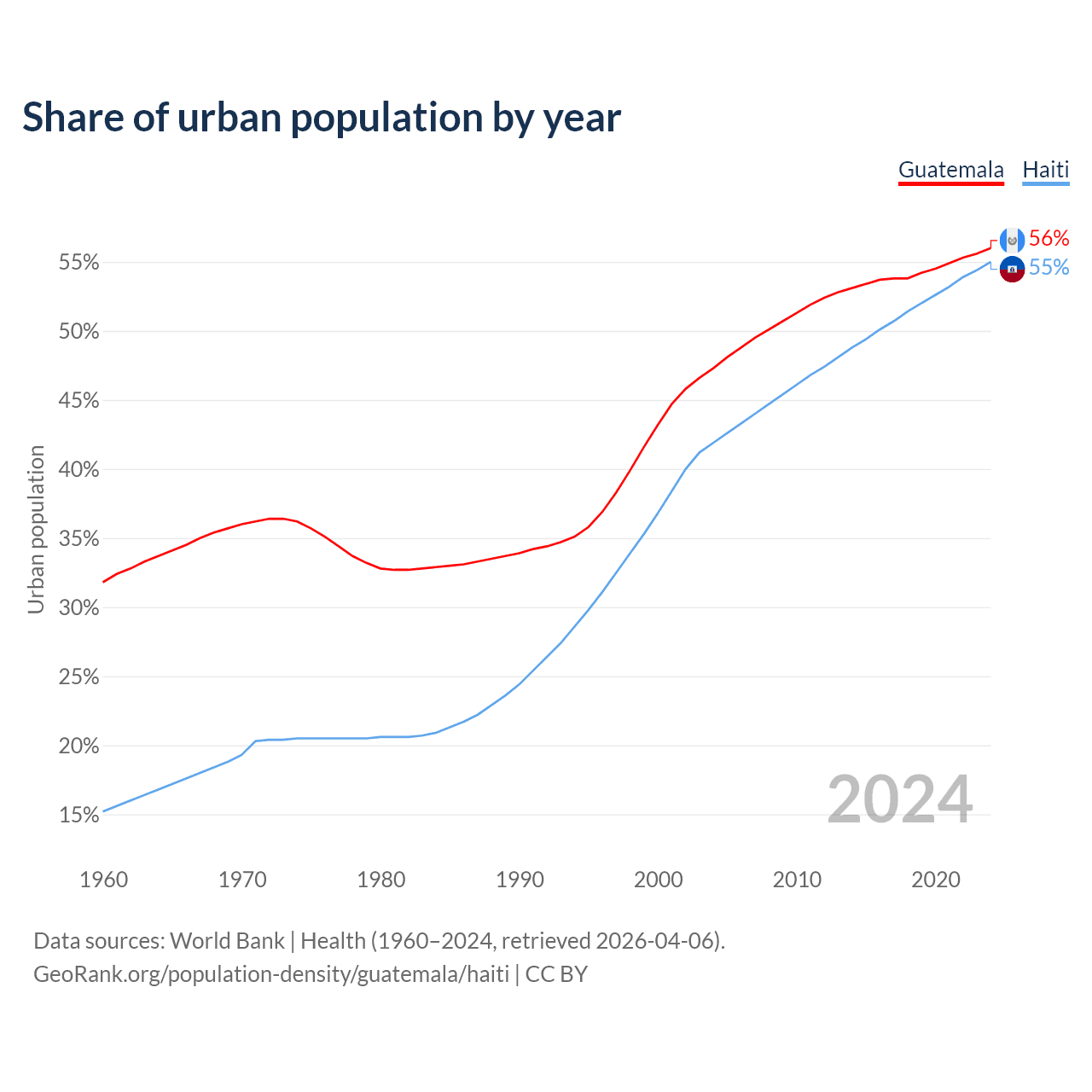 From 2004 to 2024, the share of urban population changed from 47.3% to 56% in Guatemala and from 41.9% to 55% in Haiti.