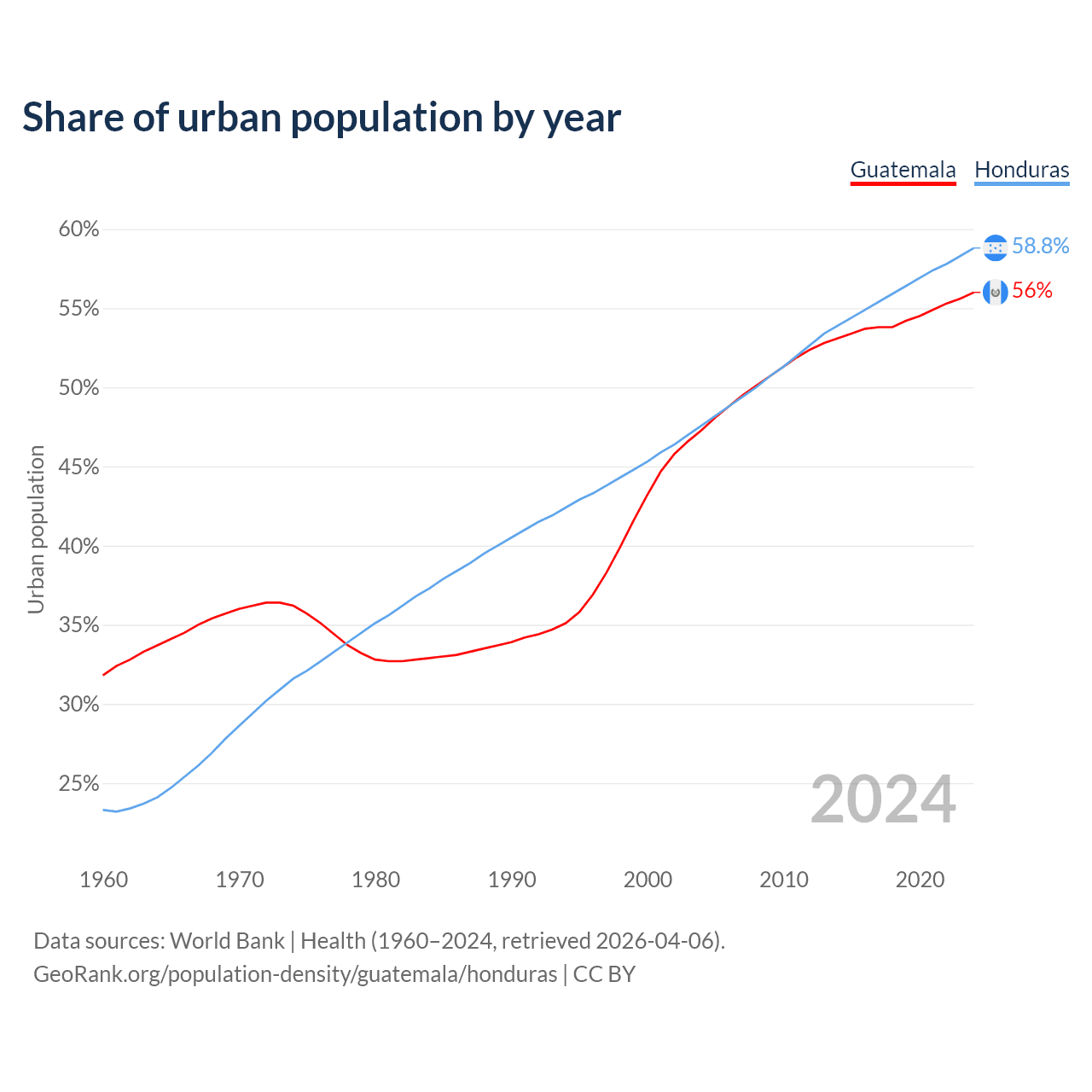 From 2004 to 2024, the share of urban population changed from 47.3% to 56% in Guatemala and from 47.6% to 58.8% in Honduras.