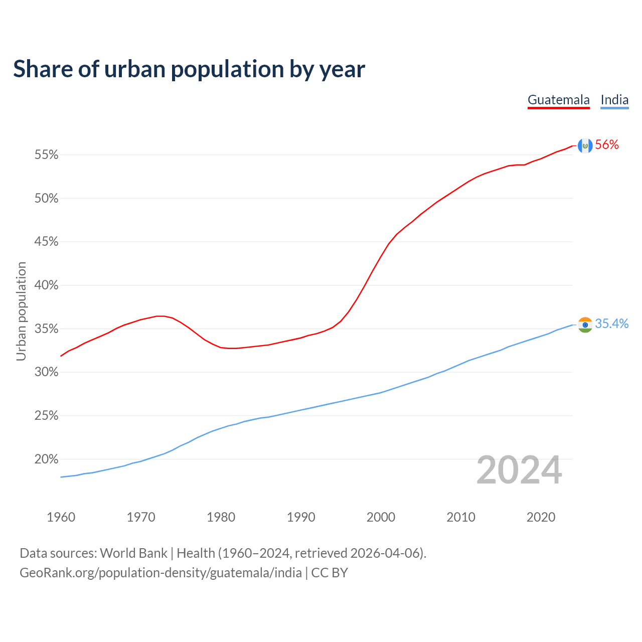 From 2004 to 2024, the share of urban population changed from 47.3% to 56% in Guatemala and from 28.8% to 35.4% in India.