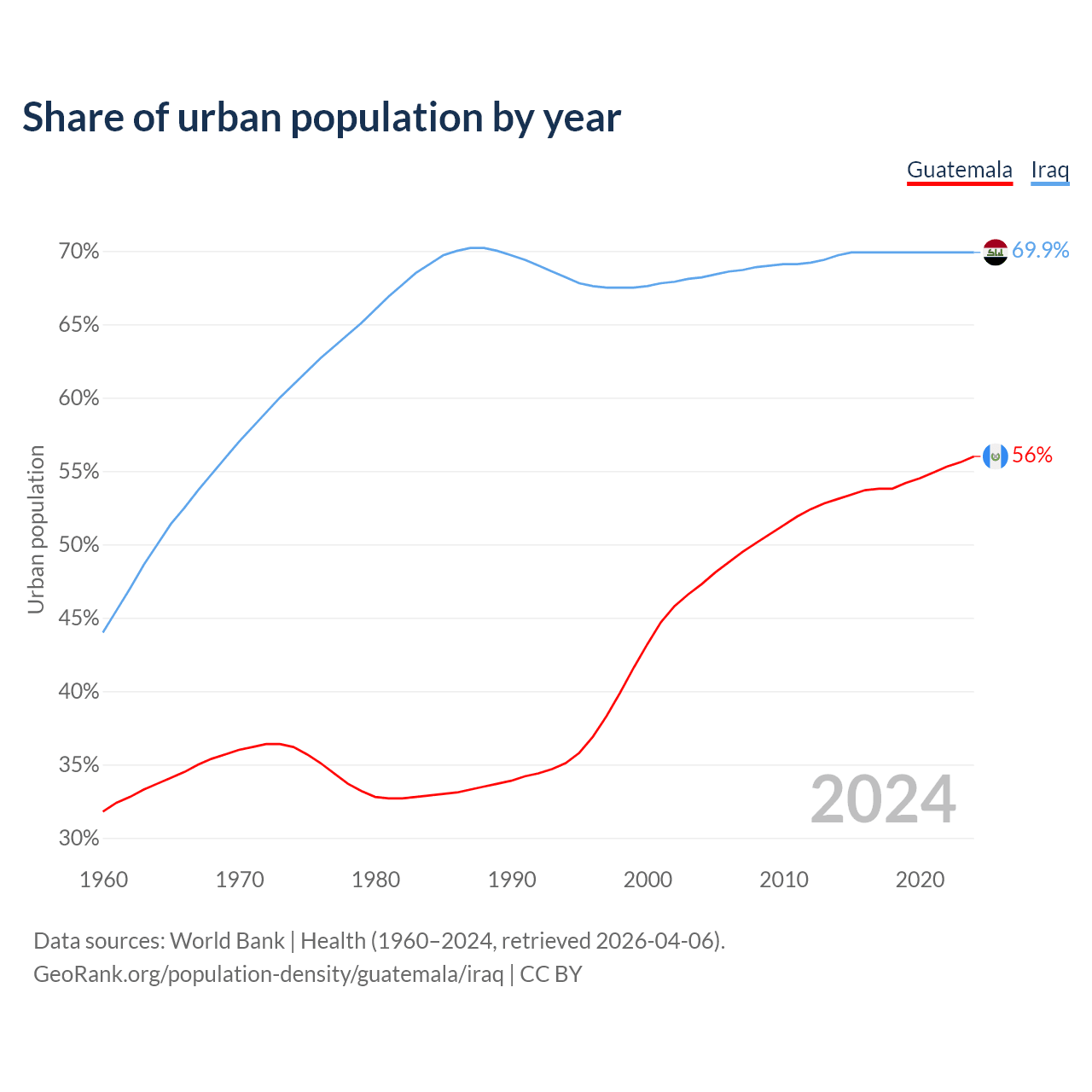 From 2004 to 2024, the share of urban population changed from 47.3% to 56% in Guatemala and from 68.2% to 69.9% in Iraq.