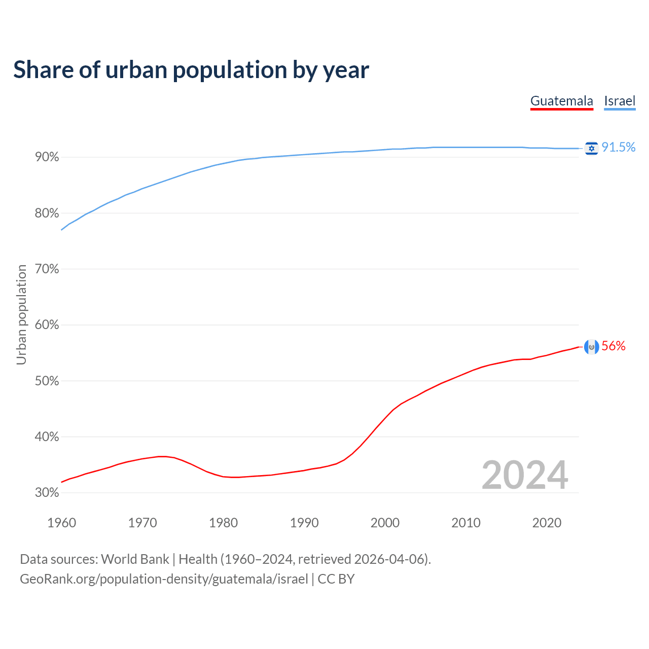 From 2004 to 2024, the share of urban population changed from 47.3% to 56% in Guatemala and from 91.6% to 91.5% in Israel.