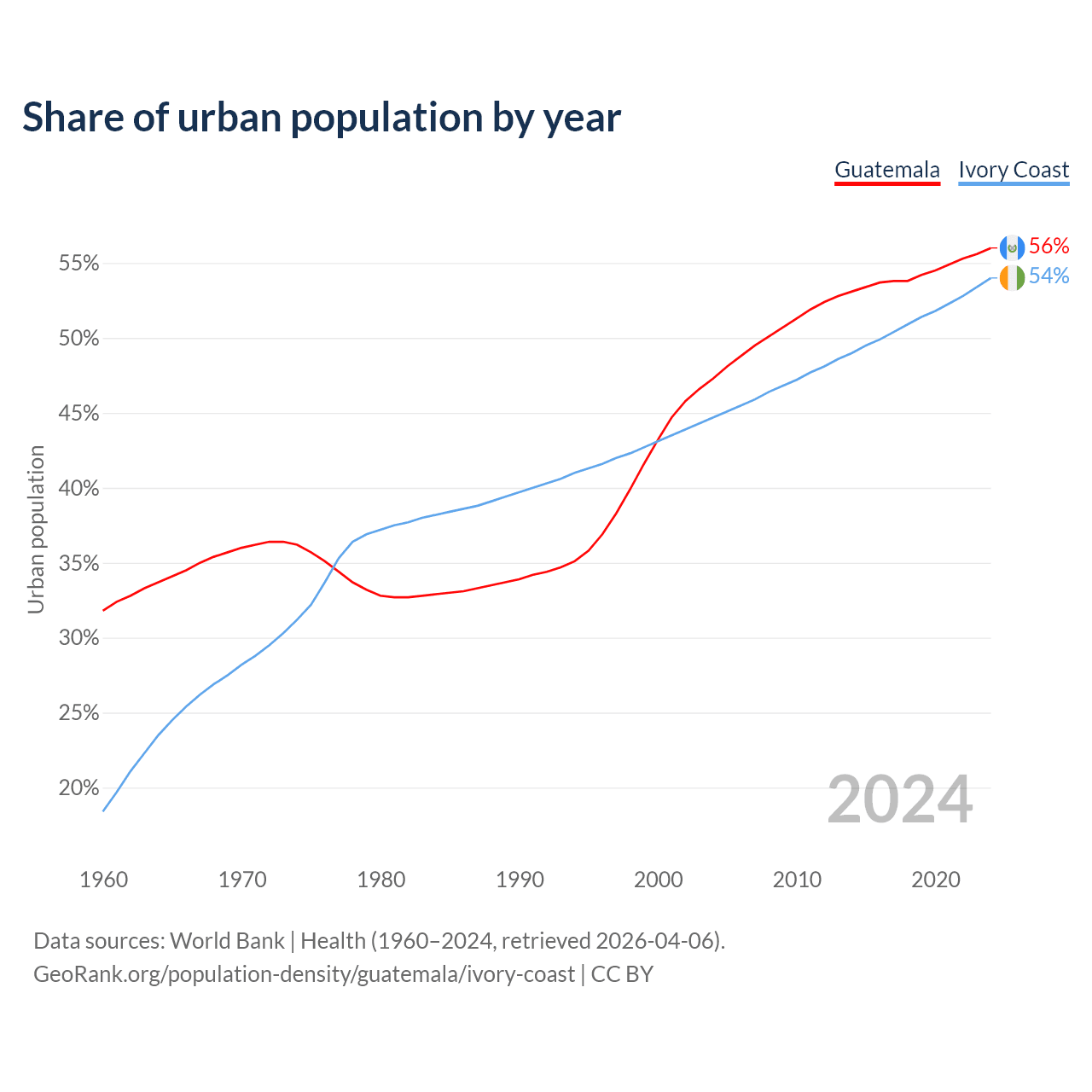 From 2004 to 2024, the share of urban population changed from 47.3% to 56% in Guatemala and from 44.7% to 54% in Ivory Coast.