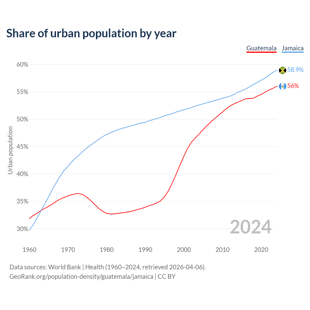 From 2004 to 2024, the share of urban population changed from 47.3% to 56% in Guatemala and from 52.6% to 58.9% in Jamaica.