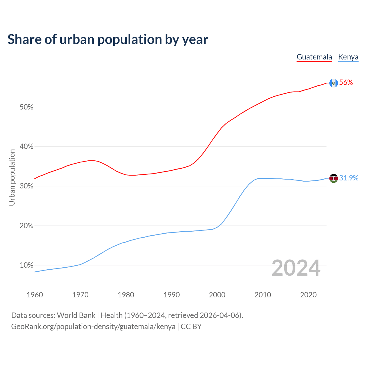 From 2004 to 2024, the share of urban population changed from 47.3% to 56% in Guatemala and from 25.4% to 31.9% in Kenya.