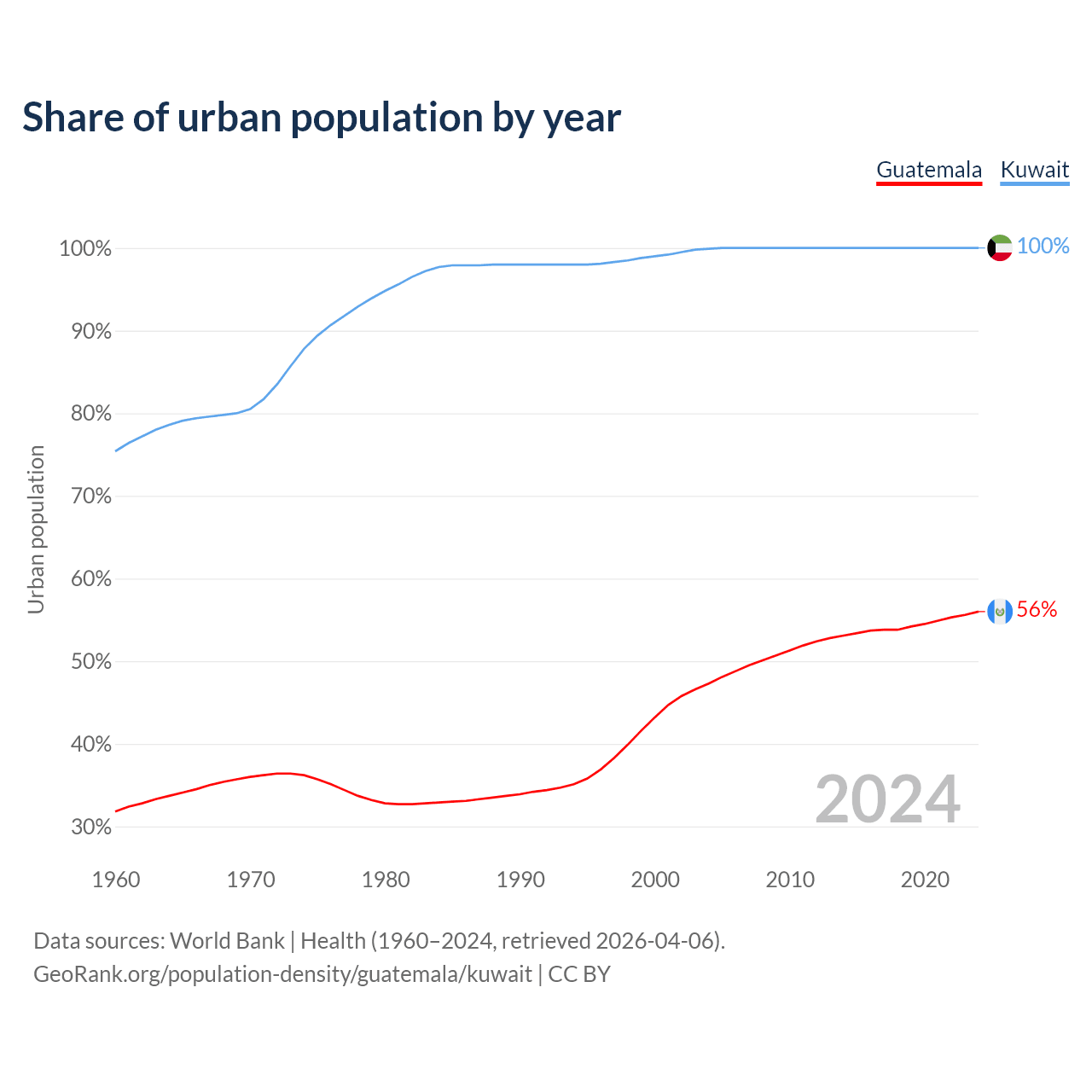 From 2004 to 2024, the share of urban population changed from 47.3% to 56% in Guatemala and from 99.9% to 100% in Kuwait.
