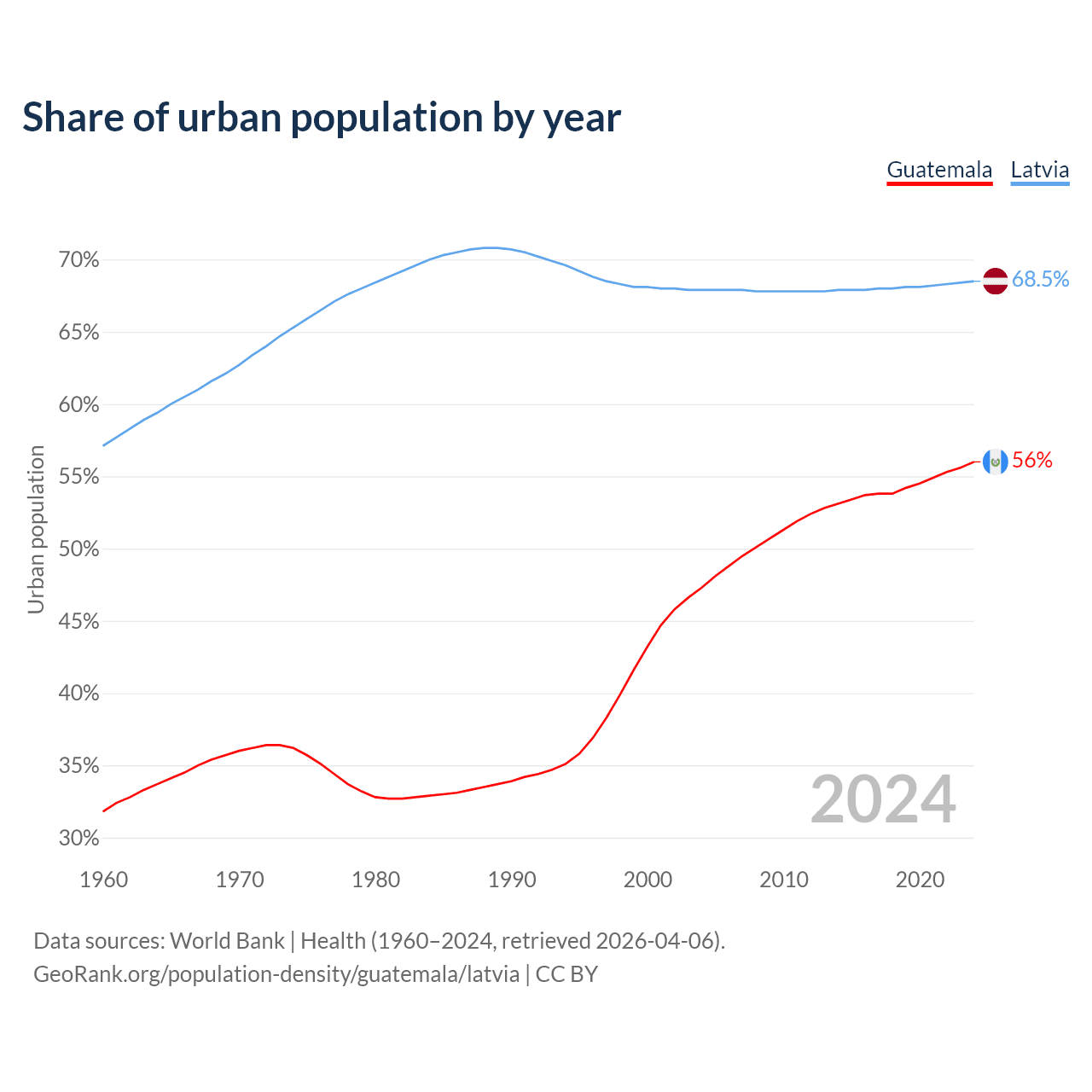From 2004 to 2024, the share of urban population changed from 47.3% to 56% in Guatemala and from 67.9% to 68.5% in Latvia.