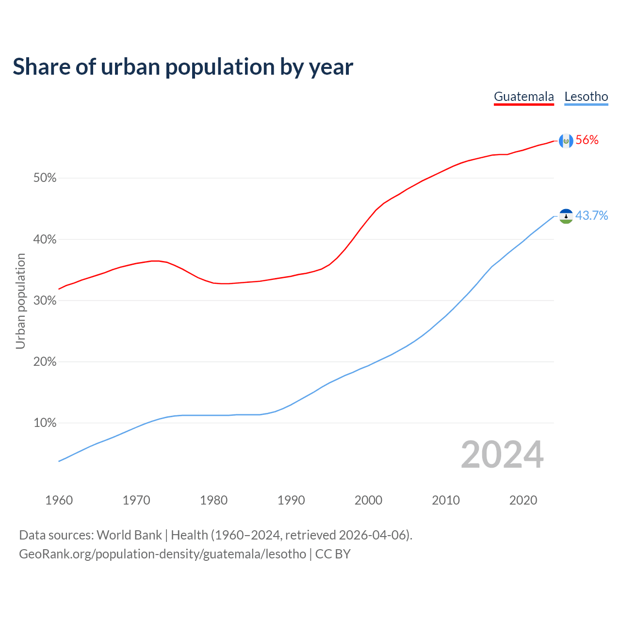 From 2004 to 2024, the share of urban population changed from 47.3% to 56% in Guatemala and from 21.8% to 43.7% in Lesotho.