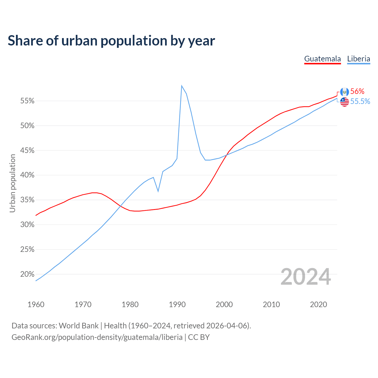 From 2004 to 2024, the share of urban population changed from 47.3% to 56% in Guatemala and from 45.4% to 55.5% in Liberia.