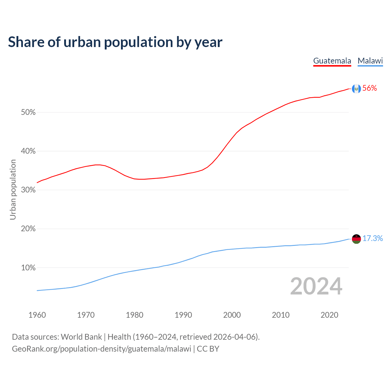 From 2004 to 2024, the share of urban population changed from 47.3% to 56% in Guatemala and from 15% to 17.3% in Malawi.