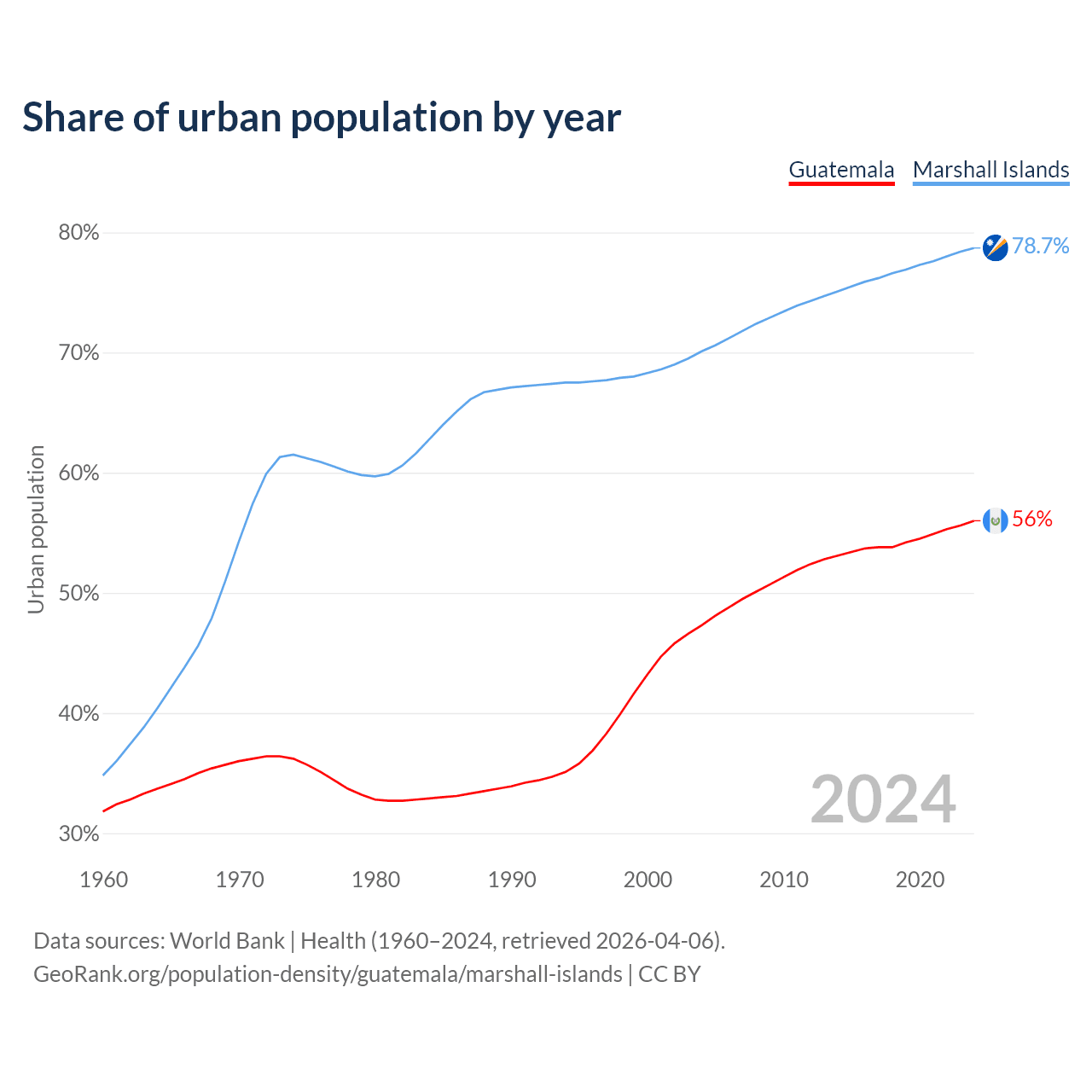 From 2004 to 2024, the share of urban population changed from 47.3% to 56% in Guatemala and from 70.1% to 78.7% in the Marshall Islands.