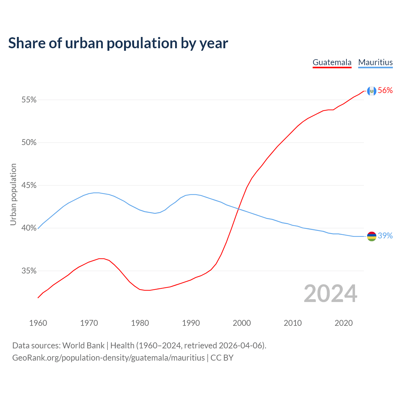 From 2004 to 2024, the share of urban population changed from 47.3% to 56% in Guatemala and from 41.3% to 39% in Mauritius.